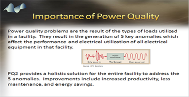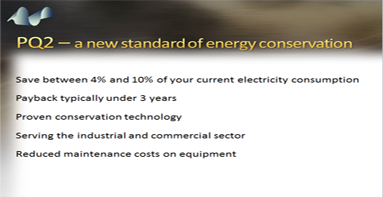 PQ2 is a state of the art energy saving and power conditioning system. PQ2 is an integrated, modular system custom designed to effectively and economically optimize power quality with guaranteed electric savings of up to 10%. Typical paybacks of less than three years are realized. PQ2 is versatile and is available in different configurations based on your facility's requirements. PQ2's multistage system is triple protected, with each stage independently monitored, protected, and activated, resulting in simultaneous addressing of multiple electrical anomalies. This eliminates the need to purchase a number of different devices to correct each anomaly.